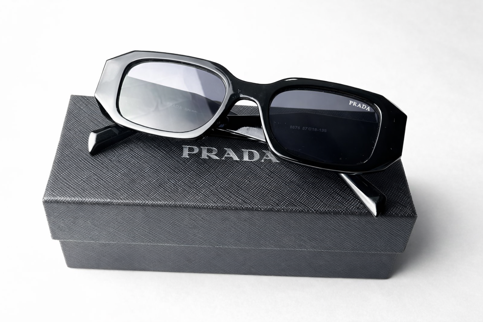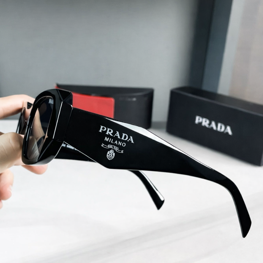 Stylish Prada Milano black sunglasses with bold geometric design, premium finish, and luxury packaging. Perfect for a modern, high-end look.